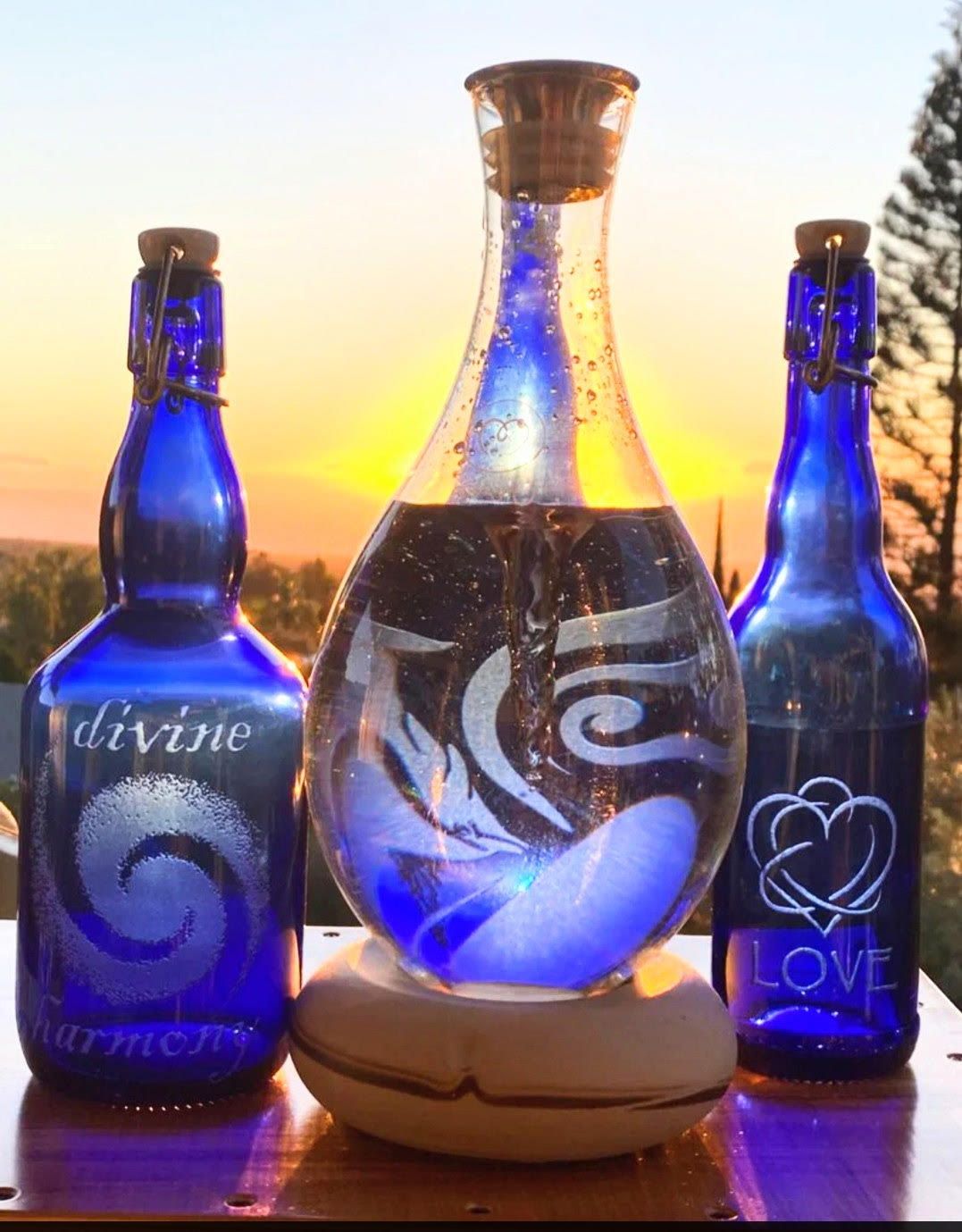 Beautiful hand sandblasted Italian Blue Glass water bottles perfect for creating Blue Solar Water, a
